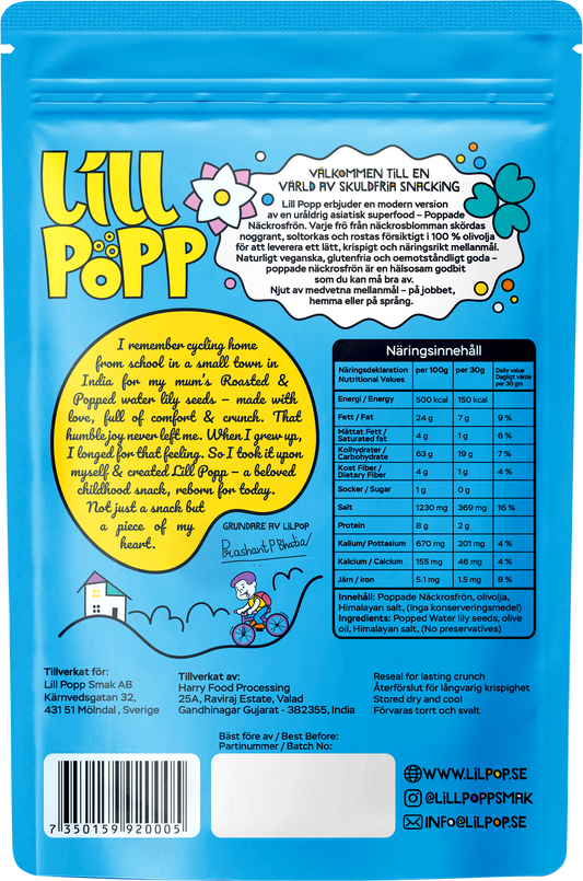 "I remember cycling home from school in a small town in India for my mum’s Roasted & Popped water lily seeds — made with love, full of comfort & crunch. That humble joy never left me. When i grew up, I longed for that feeling. So I took it upon myself & created Lill Popp — a beloved childhood snack, reborn for today. Not just a snack but a piece of my heart"