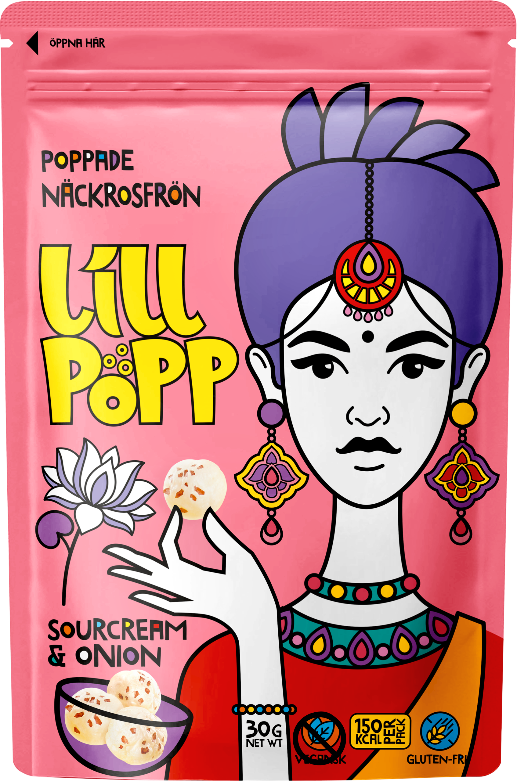 Innehåll: Poppade näckrosfrön, olivolja, lökpulver, fettpulver, mjölkpulver, persiljeblad,